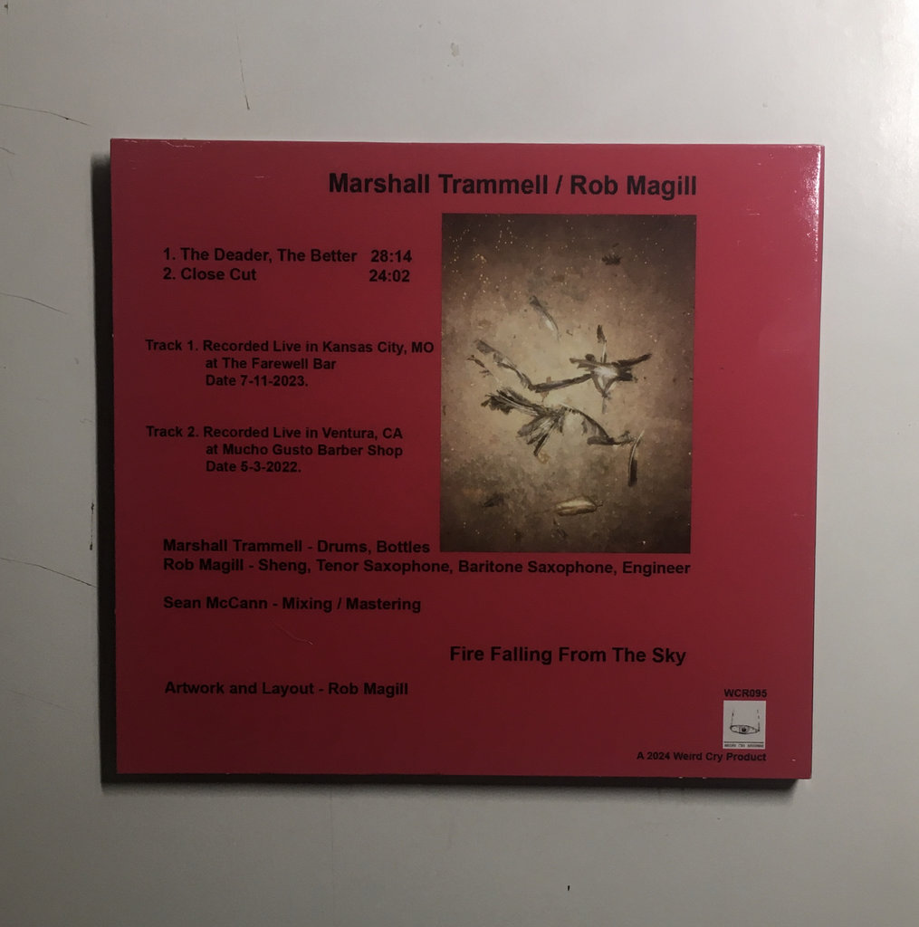 Percussionist Marshall Trammell and saxophonist Rob McGill collect two kinetic improvised performances on Fire Falling From The Sky. “The Deader, The Better” kicks off a 28-minute free jazz odyssey with absolute fervor as McGill and Trammell deliver searing performances, each building the other up to a roaring peak before settling down like embers. “Close Cut” offers an excellent flip-side, blending Trammell’s hypnotic percussion with McGill’s performance on sheng, a traditional Chinese wind instrument that creates fluttering harmonies. With unpredictable percussion, shifts between sheng or sax, and one well-timed yell, it makes a perfect counterpoint.