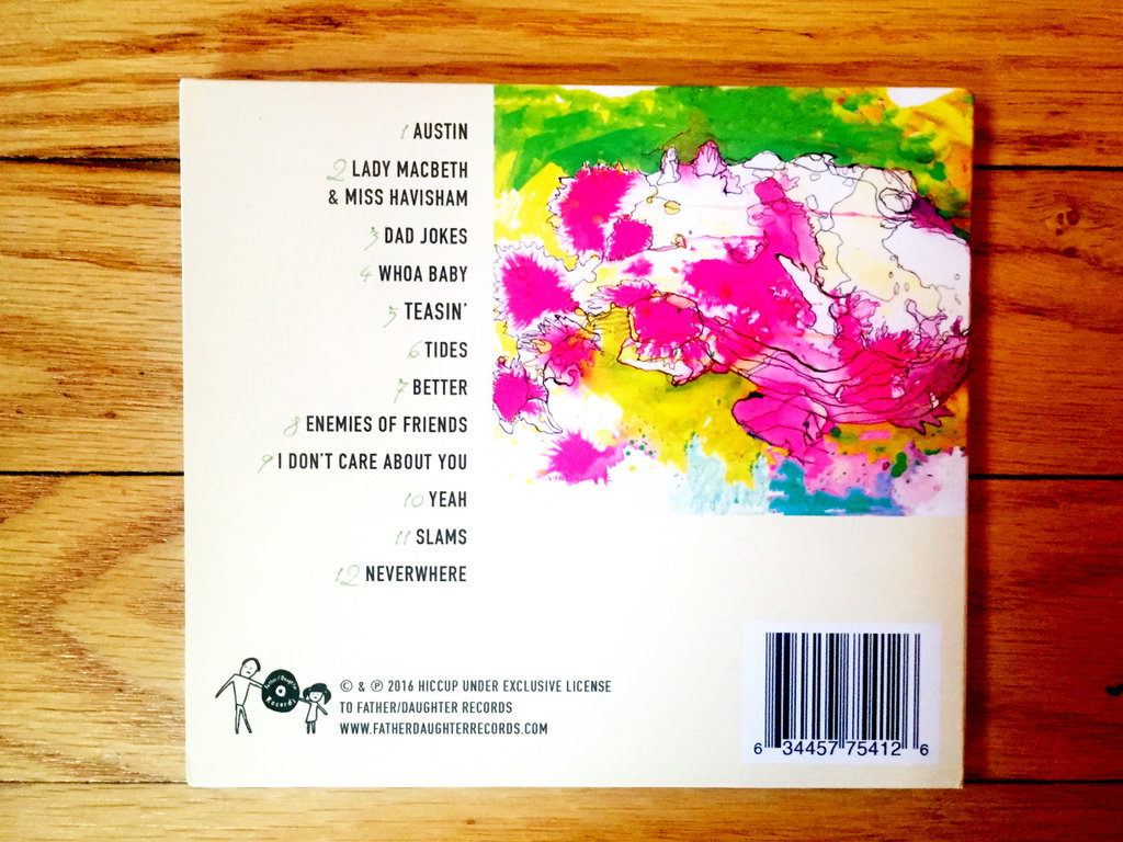 Bulleit and Clute, who trade vocals and harmonize throughout the record, still take cues from their 30-second jingle writing days: the songs on Imaginary Enemies are terse bursts of energy, none of which stretch past the three-minute mark. Up-tempo rockers like “Austin,” “Dad Jokes,” and “Teasin’” blend seamlessly into one another, but Hiccup’s debut has more musical and lyrical versatility than it seems on first glance. Album highlight “Lady MacBeth & Miss Havisham” recalls the endearingly bookish pop-punk of England’s Martha, while the solo-acoustic duet “Enemies” hints at the songwriting duo’s expanding bag of musical tricks.