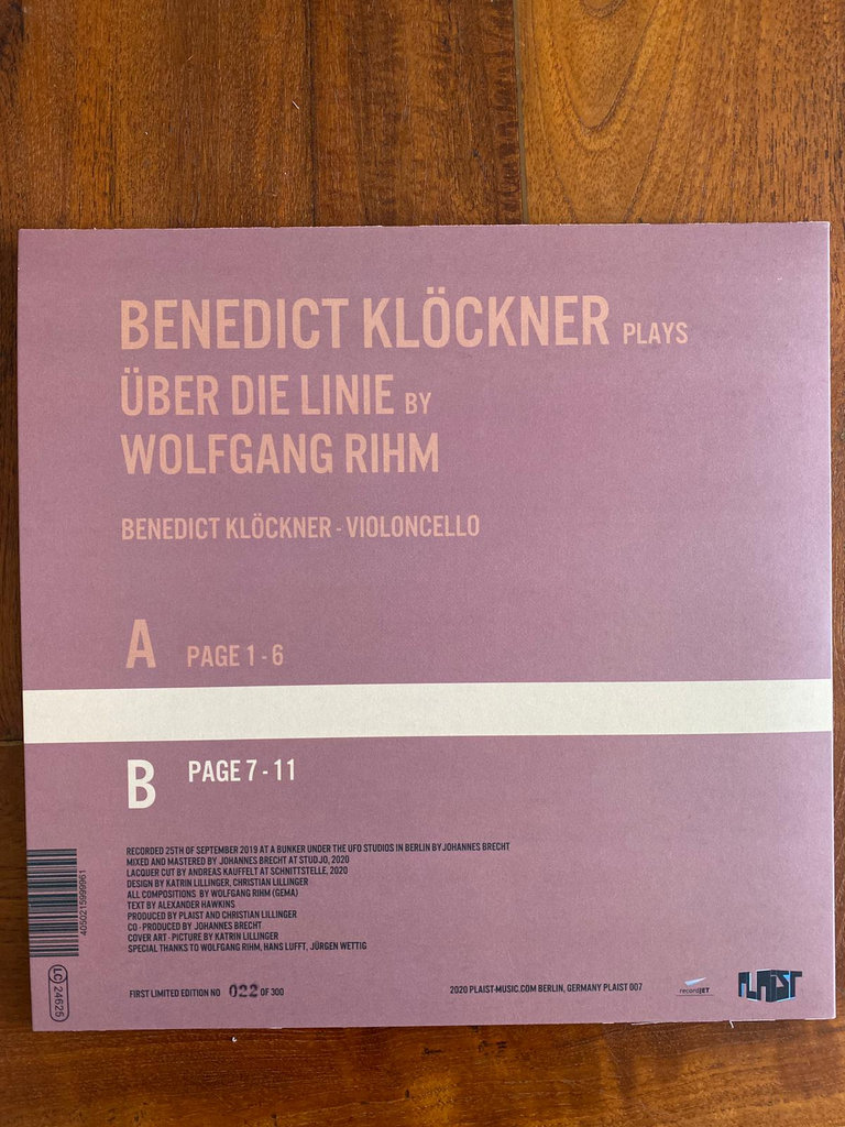 In his perceptive liner note essay for this recording of Wolfgang Rihm’s 1999 solo cello piece “Über die Linie” (“About the line”) Alexander Hawkins notes, “It might feel like part of an ongoing stream of sound, which began before the listener entered it, and might continue for some time after they leave.” German cellist Benedict Klöckner recorded the work—once called “unplayable” by Heinrich Schiff, for whom it was written—in a deeply reverberant former Nazi bunker in Berlin, drenching his performance in lingering overtones, and, indeed, it does transmit a certain eternal quality. Rihm’s solemn melodies are consistently pierced by harrowing outbursts, creating a kind of ongoing struggle for the performer to maintain a linear flow. The dynamic range might be daunting to a performer, but it’s thrilling to be immersed within it. The choice of location was deliberate, further complicating the performance by requiring the musician to grapple with how his reading of the score threads the enveloping ambience of the space, whether it’s the papery rustling of his bow pulling against the strings or a sudden, violent stroke serving as a jolt of electricity that momentarily subsumes everything around it. The bunker’s historic weight can’t help but imbue the proceedings with an air of darkness, but Klöckner envisions the performance as an act of defiance in his embrace of so-called “Entartete Kunst” (degenerate art).