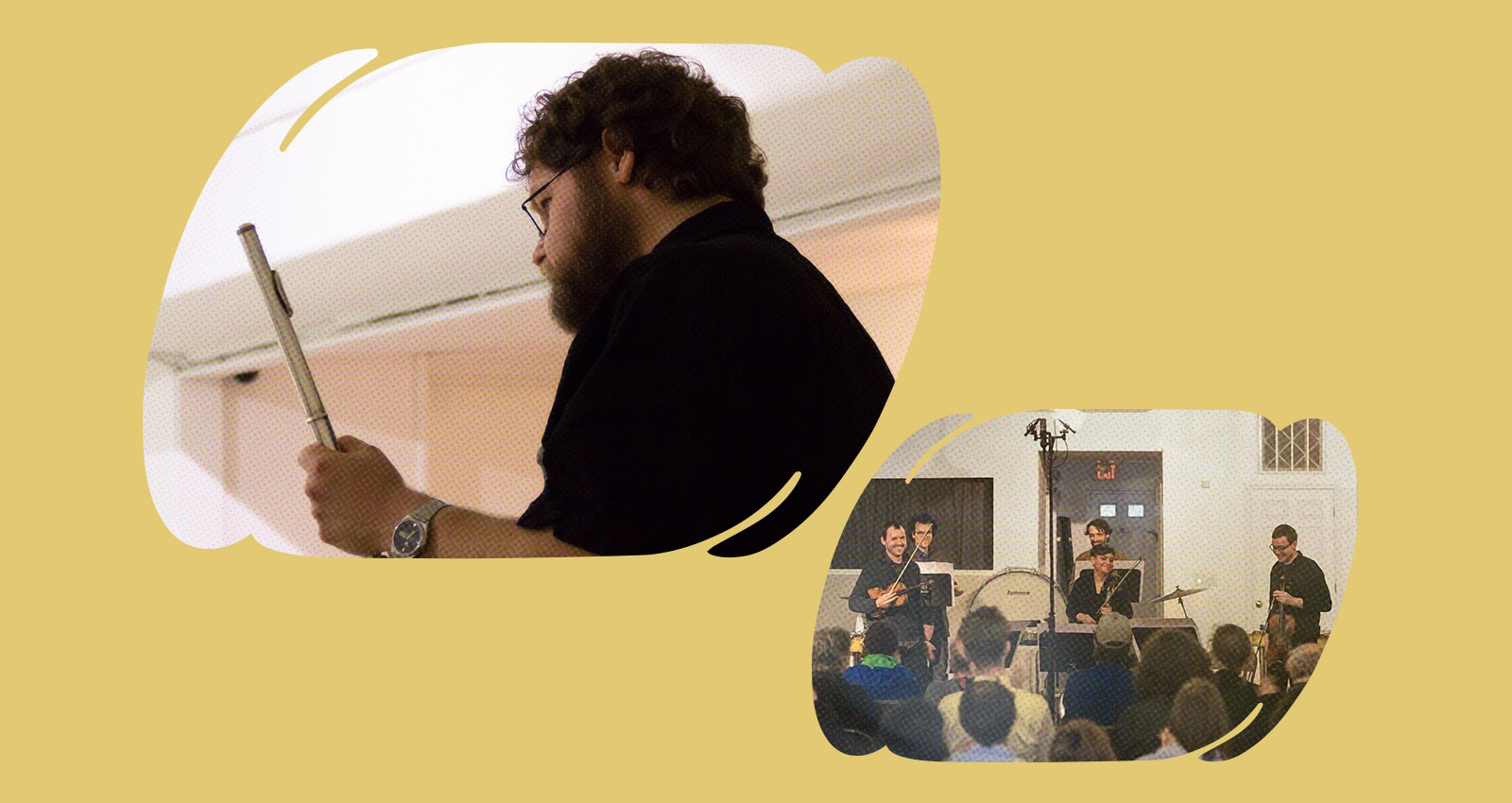 Lucier’s “Corner Church and High” cites the intersection where Wesleyan’s old music department was located, where one could hear disparate student-produced sounds colliding outside of the building. Sustained long tones on viola, violin, and cello unleash visceral acoustic beating as their sonic veil is pierced by bowed and struck tuned percussion. The tactics are familiar to Lucier admirers, but that doesn’t change the fact that this is a wonderful place to get lost in for 20 minutes. Dykstra’s “32 Middle Tones,” an elliptic play on his old address, fits perfectly here, as cellist Laura Cetilia harmonizes—using both her instrument and her voice—with the chord progressions sketched out on viola and violin. Notated silences break each iteration up, changing subtly with every pass, as the two percussionists provide frictive accents.
