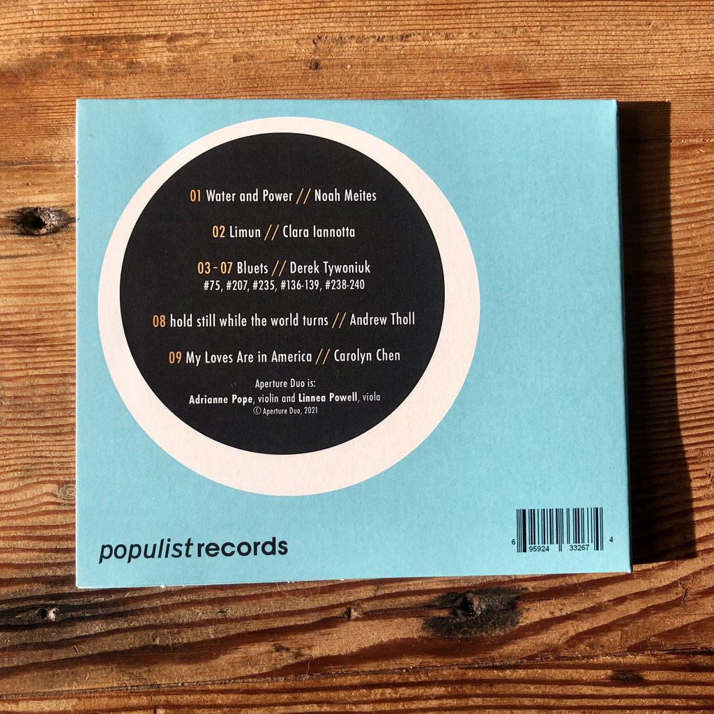 Crucial members of the L.A. new music scene, violinist Adrianne Pope and violist Linnea Powell deliver a stunning debut album as Aperture Duo, largely turning to fellow community members for most of the repertoire on this eponymous effort. The album opens with “Water and Power” by Noah Meites, an intense evocation of Black migration from Louisiana to California spurred by the Great Mississippi Flood of 1927 that interjects a lick from a Creole fiddle tune amid its contemporary ennui. The duo deftly toggles between styles and eras without a hiccup, even adding a vocal refrain towards the piece’s end. “Limun” by the Berlin-based Italian composer Clara Iannotta is the non-L.A. outlier. Still, musically it fits right in, a marvel of slashing-then-whispering friction where the strings generate sharp edges and sour harmonics (the title is Serbian for lemon) and engage in a seamless ballet.