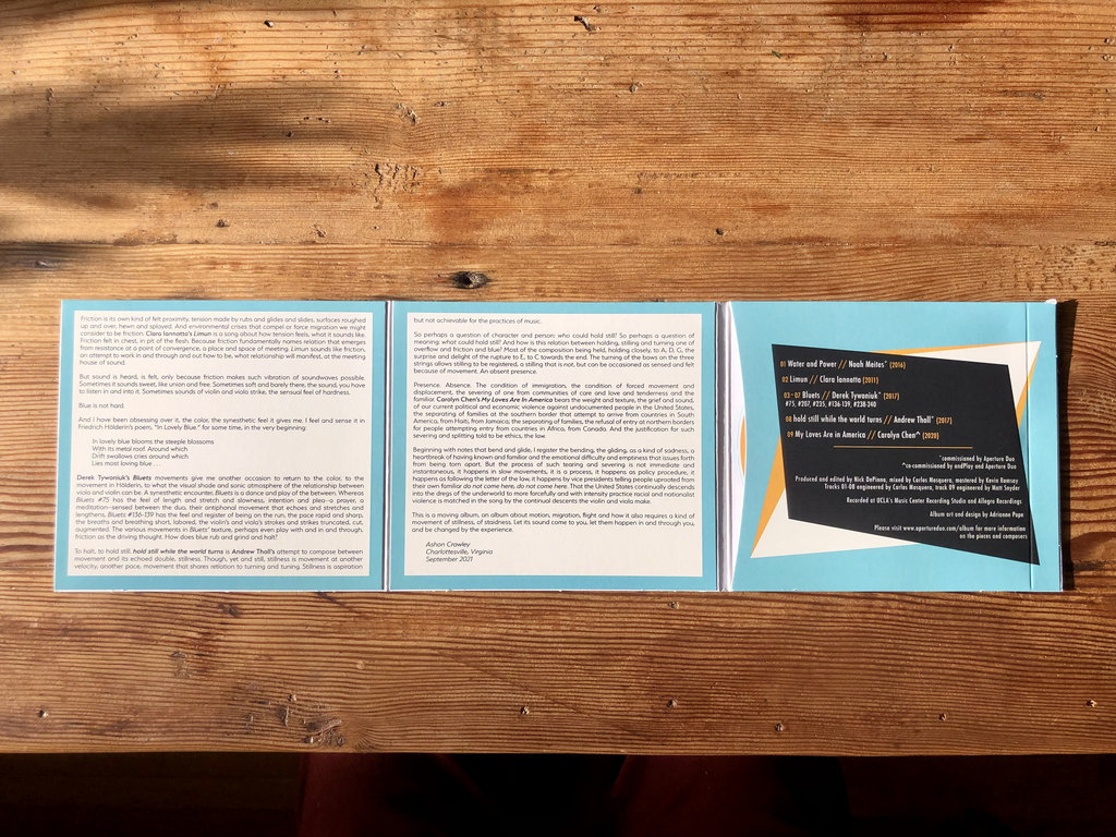 While the pieces from Derek Tywoniuk and Andrew Tholl are also superb, Carolyn Chen was responsible for the album’s highlight, “My Loves Are in America.” The piece was co-commissioned by Aperture Duo and andPlay, the New York viola-violin duo that has also recorded Iannotta’s piece. It echoes some of the migratory concerns in the Meites work. Still, the music reflects how broader transnational immigration has torn families apart and how American policy inflicts pain and difficulty from those attempting to make a better life: idea-packed, cogent, and knowingly grappling with conflicting emotions.