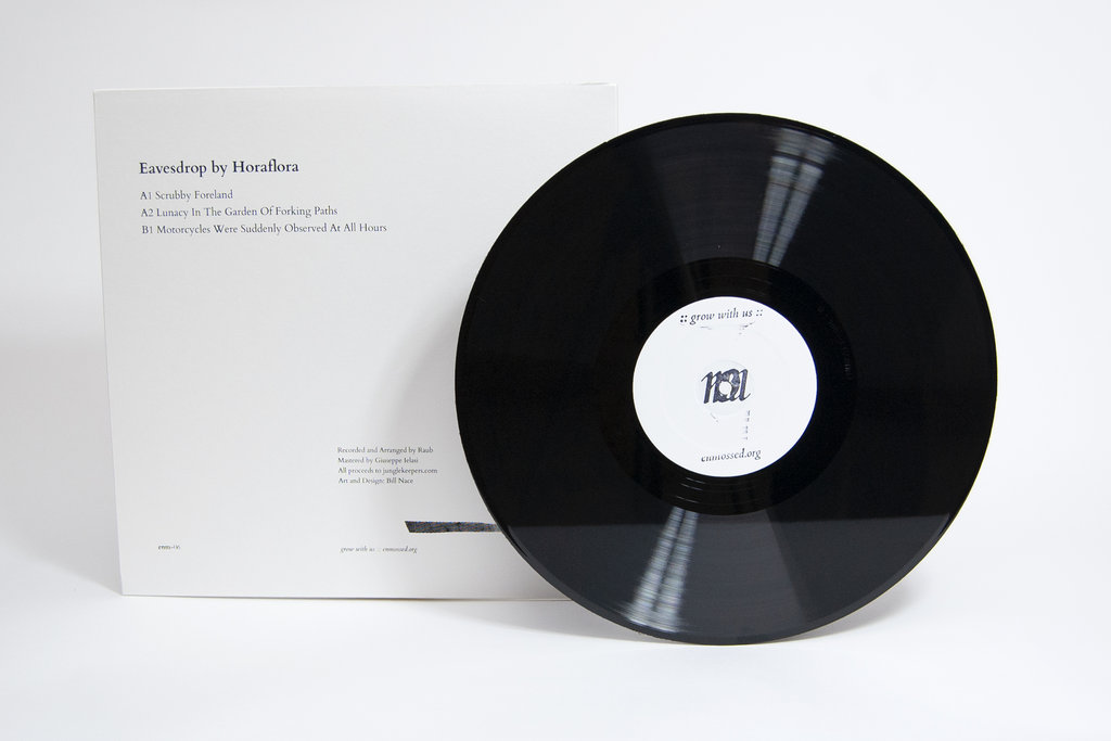 The name of Raub Roy’s solo project Hora Flora is short for “Horrific Flora,” which he explains as “like when you get real close up to a plant in your garden, usually teeming with life, little critters and textures, all contributing to the overall impression, but when focused on, each object is its own little world.” Accordingly, Roy’s mix of field recordings and instrumentation isolates slices of reality and blows them up larger than life. The three pieces on Eaves Drop have a fly-on-the-wall feeling, except the wall is constantly warping, making the room go in and out of focus. At times the world breaks in fully: Take the sudden bird shrieks halfway through “Lunacy In The Garden Of Forking Paths,” or the excited voices of kids that follow. But those sounds are eventually transformed into mysterious abstraction, as Roy sifts the raw material of consciousness into the poetry of dreams