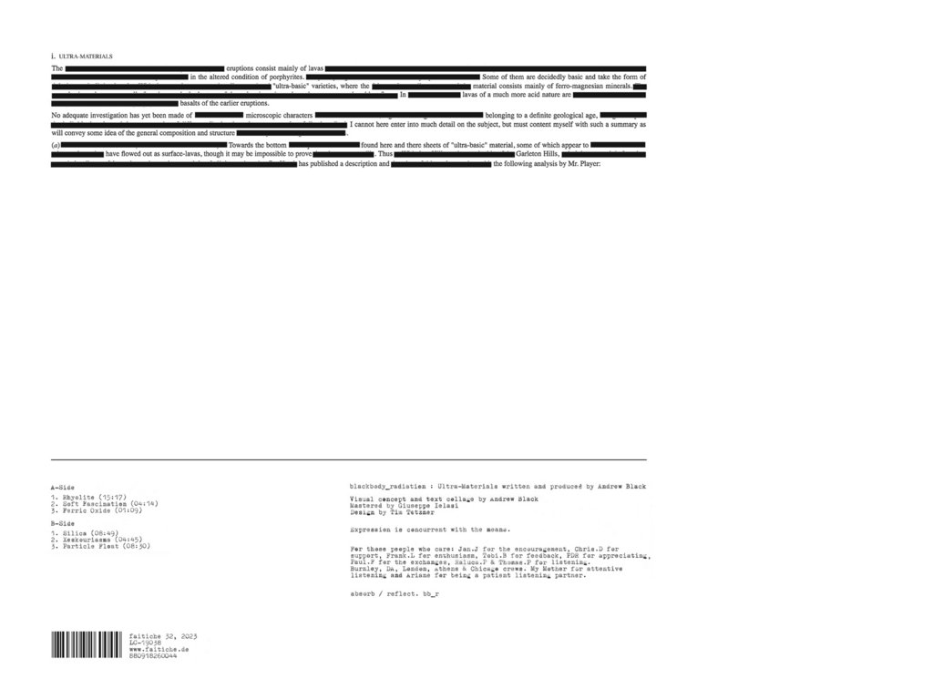 Andrew Black’s debut as blackbody_radiation is built from environmental recordings and sound masking, in which artificially generated frequencies modulate room tones by covering up, or masking, background noise. Here, Black deploys the technique to draw out the natural reverb of the spaces in which he records. We don’t know where he is exactly, though it sounds like he’s exploring cavernous, abandoned industrial buildings. “Rhyolite” begins with a looped voice like a malfunctioning airport announcement that is slowly subsumed by dense drones. “Silica” sounds like static blasted into an empty factory floor, while “Xeskouriasma” evokes the clang and clatter of some forgotten pier. Taken together, these seven tracks are a dark and moody exploration of spatial acoustics and an exciting introduction to a new artist.