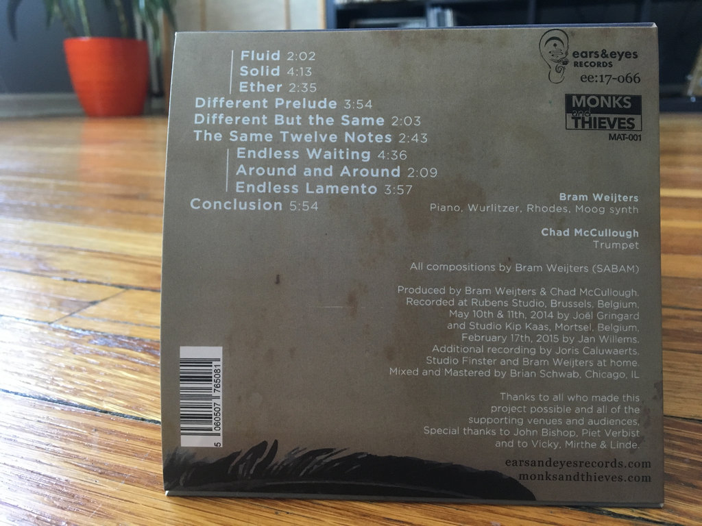 Over the span of four years, the quartet of pianist Bram Weijters and trumpeter Chad McCullough released three albums that worked the spot where modern straight-ahead jazz crossed over into melody-focused instrumental music. It’s an area where the threads of structure and restraint become frayed by the incessant pull to follow melodic imagery, no matter where it wanders. More often than not, it was the drums-bass combo of John Bishop, Chuck Deardorf, and Piet Verbist that kept everything on track. But on their latest collaboration, Weijters and McCullough go it alone, and it goes a long way to illuminate the cinematic qualities that previous releases merely hinted at. “Different Prelude” would be right at home in a John Carpenter soundtrack, while “Different But The Same” gives the impression of a composition that broke free from an Erik Satie tribute. There’s a warmth and intimacy that comes from playing together over time, and it’s transmitted by the duo on their new endeavor. When the melody is refracted on “Endless Lamento,” it possesses the same welcoming touch as the straight-forward ballad “Conclusion.” The Weijters-McCullough collaborations are well worth exploring, and there’s absolutely no reason not to start with their latest.