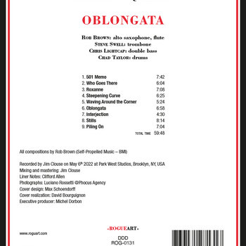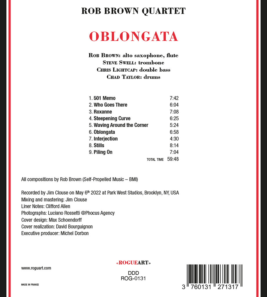 “[Alto saxophonist and flutist] Rob Brown is somebody that people need to hear,” Braufman says. “He’s such a fine player! Every time I listen to him, I’m floored. I’m a tone person; if I don’t like somebody’s sound, I don’t want to listen to the notes they play, but if I love somebody’s sound, they can come play a major scale and I’ll listen to it because of the tone. Rob has a gorgeous tone, and on Oblongata he matches it with great ideas and intensity.”