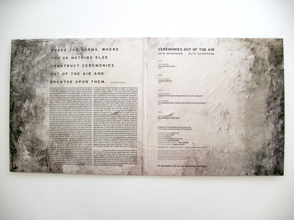 Holding down saxophone duties as a member of Irreversible Entanglements, Keir Neuringer’s playing is capable of conjuring quiet, meditative spaces of sound as well as voluminous displays of force. Ceremonies Out Of The Air is a 79-minute performance composed in mourning for his mother and recorded on the spot at the First Unitarian Church in Philadelphia in the summer of 2013. Throughout the performance, Neuringer displays a capacity for playing long, extended patterns through the use of circular breathing techniques while the moments of delicacy and intimacy contrast the great physical force behind his playing.