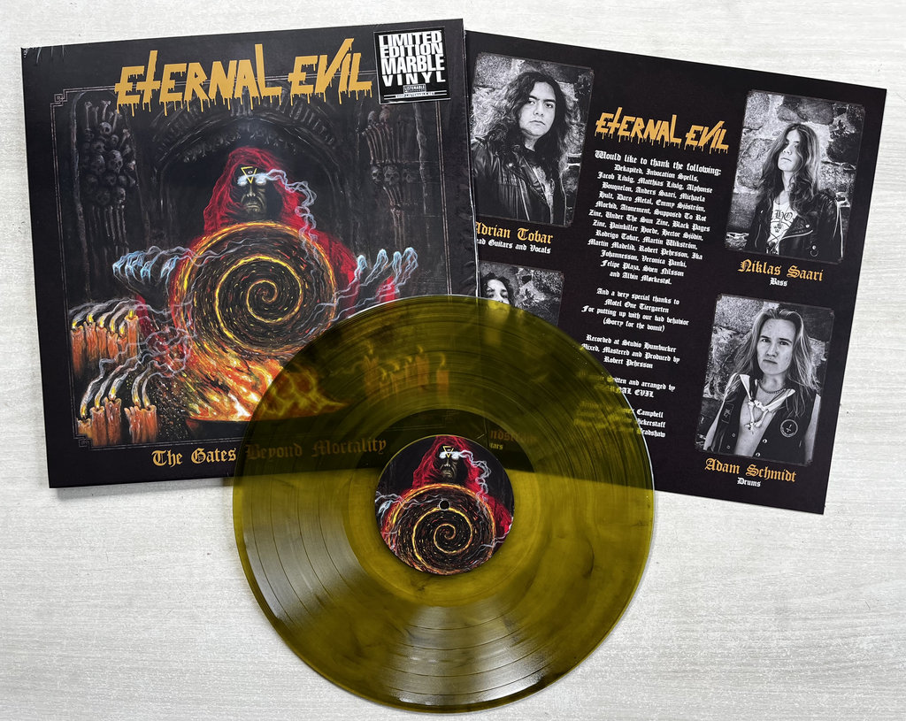 Before Eternal Evil, Tobar played in another ultra-young band called Three Dead Fingers. (“We played the Sweden Rock Festival when I was 14 years old, and I was scared as shit,” he laughs.) He brought that experience into Eternal Evil, who made their auspicious debut with 2021’s incredibly titled The Warriors Awakening … Brings the Unholy Slaughter! That album wears its early Slayer and Kreator influence on its sleeve, almost to a fault. A new lineup joins Tobar and co-guitarist Tobias “Ozzy” Lindström on its follow-up, The Gates Beyond Mortality, and you can hear the Eternal Evil sound begin to open up.