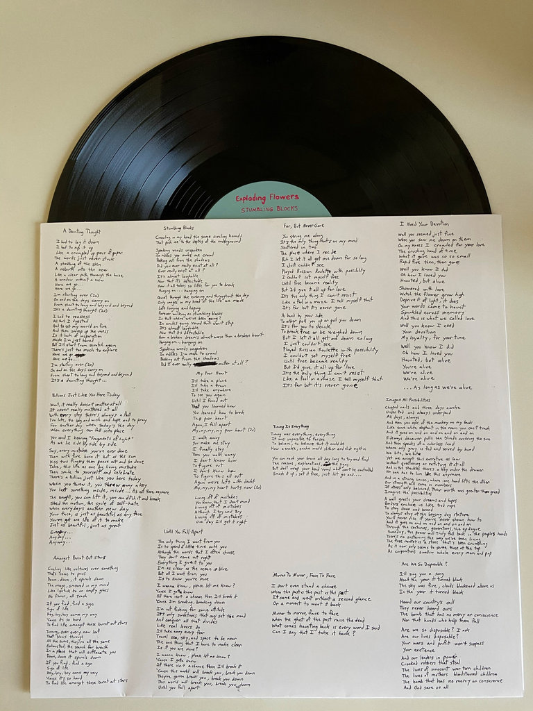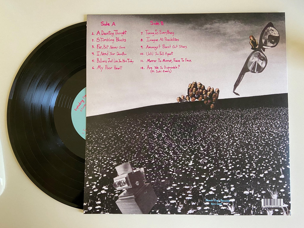 Dearest music lovers, let us never allow the doofuses who have, in recent years, blessed us with such genius opinions as “the Beatles are actually bad” to ever discover the existence of the Byrds, a band that might just be even more foundational to guitar pop than their own inspiration (the Beatles). Starting with the chiming riff on Gene Clark’s “Feel A Whole Lot Better” in 1965, the Byrds’ 12-stringed legacy stretches all the way up through British Power Pop in the ‘70s to the American Paisley Underground and New Zealand’s hallowed Flying Nun in the ‘80s, through every subsequent strain of indie pop, from Sarah Records to Slumberland. From this hallowed bloodline now springs Stumbling Blocks, the blissful new full-length from Exploding Flowers, a quartet that features L.A. scene vets who’ve done time in Alice Bag’s band, Future Shoxxx, Sex Stains, and Cody Chesnutt, among other acts. With its finely honed approach to simple, yet heartfelt material tinged with the right amount of melancholy and reverence for its forebears without veering into imitation, Stumbling Blocks is a colorful and kind-spirited amalgamation that will press all the right buttons for a certain type of pop fan starved for some old-fashioned jangling guitars, handclaps, and sparkling melodies in these days of glitchy suspended animation experienced mainly via computer screen. Suki Ewers of Mazzy Star and Opal provides guest vocals on closing track “Are We So Disposable?” connecting the dots and sealing the deal.